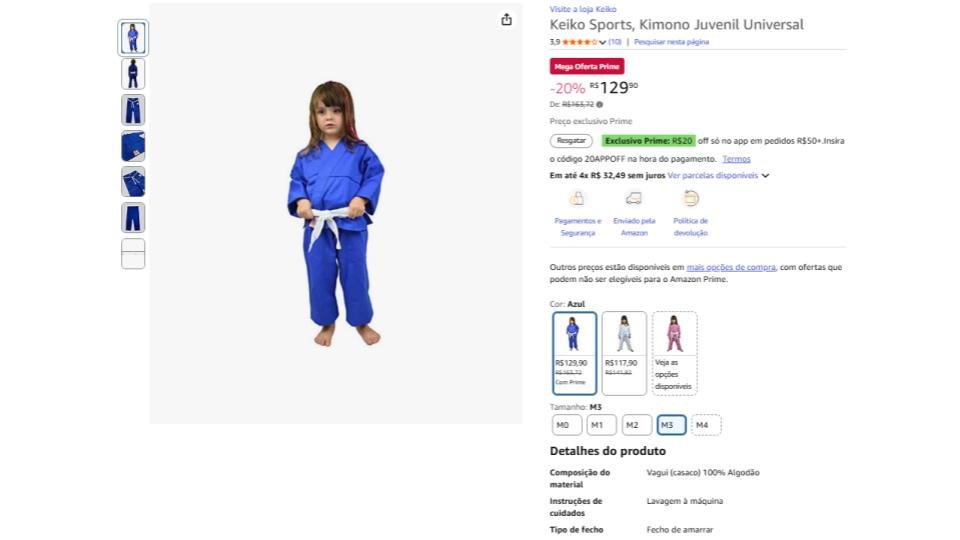 Você garante um produto de alta durabilidade e versatilidade por um valor que cabe no seu planejamento: apenas R$129,90 com a assinatura Amazon Prime. É um preço super justo para quem busca qualidade, segurança e economia no primeiro kimono.